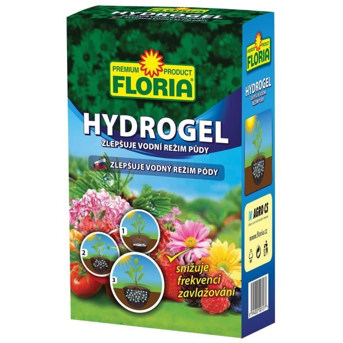 FLORIA Hydrogél je špeciálny práškový koncentrát s vysokou absorpčnou schopnosťou. Zvyšuje zadržiavanie využiteľnej vody v pôde alebo substráte, a tým znižuje frekvenciu zavlažovania. Po obalení koreňov časticami hydrogélu sú korene dostatočne zásobené vodou. Používaním zabránime vyplavovaniu cenných živín a zvyšujeme prežitie nových stromov a kríkov po výsadbe. Zaisťuje lepší kontakt koreňov rastlín s pôdou. Použitie je vhodné pre všetky rastliny na záhrade.