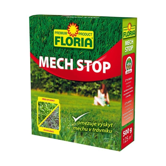 FLORIA Mach stop je špeciálne hnojivo určené na obmedzenie výskytu nežiaduceho machu v trávniku. Podporuje rast tráv a zaistí sviežu zelenú farbu trávnatého porastu. Hlavnú zásluhu na vymiznutí machu z trávnika má vysoký obsah železa (27 %). Použitie je vhodné vo všetkých typoch trávnikov. Prípravok odstraňuje chlorózu (žltnutie) trávnika. Používa sa najčastejšie skoro na jar a na jeseň, kedy sa machy v trávniku hojne vyskytujú. Jedinečné zloženie hnojiva a jeho prášková podoba umožní bezproblémovú, rovnomernú aplikáciu.