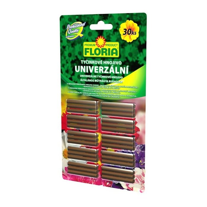 FLORIA Univerzálne tyčinkové hnojivo s GUÁNOM je vhodné pre všetky druhy rastlín, vrátane balkónových. Vďaka svojej vyváženej forme živín podporuje tvorbu nových koreňov a zdravý rast rastlín a zaisťuje rastlinám bohatšie kvitnutie a krásne vyfarbenie kvetov. Hnojivo dodáva do substrátu organickú hmotu v podobe prírodného hnojiva GUÁNO s veľmi účinnou dusíkatou a fosforečnou zložkou. Toto hnojivo je obľúbené vďaka jednoduchej a rýchlej aplikácii.