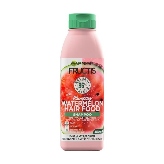 Vyplňujúci šampón na vlasy Watermelon Hair Food od Garnier Fructis s obsahom kokosového oleja, vitamínom E, C a výťažkom z melóna sa účinne a šetrne stará o jemné riedke vlasy a navracia im pôvodnú vitalitu a lesk. Obsahuje 96 % prírodných látok. Šampón vaše vlasy jemne čistí, vypĺňa štruktúru vlasu, dodá im objem a hebkosť. Jeho ľahká receptúra vlasy nezaťažuje. Skvelým benefitom je tiež iskrivá melónová vôňa a zaujímavý dizajn šampónu. Pre nádherne ošetrené vlasy je tu Fructis Watermelon Hair Food!