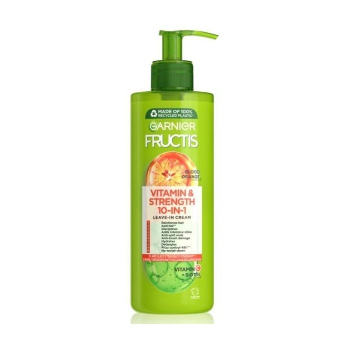 Fructis kondicionér na vlasy 10v1 Vitamín & Strength je vhodný na posilnenie vlasov. Vo svojej viacúčelovej receptúre bezoplachovej starostlivosti spája výťažky z červeného pomaranča s derivátom vitamínu C a biotínom na posilnenie vlasov, zníženie ich vypadávania kvôli lámavosti a lepšiu poddajnosť a úpravu. Objavte svoju dennú dávku 10v1 bezoplachovej starostlivosti obohatenej o vitamíny od značky Fructis!