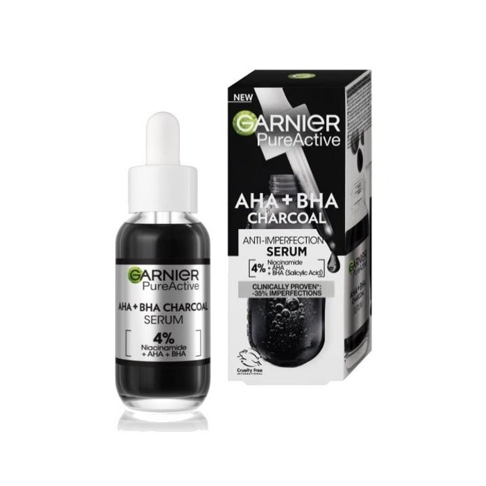 Sérum proti nedokonalostiam Garnier PureActive AHA + BHA Charcoal so 4 % obsahom látok pomáha redukovať pupienky a vzhľad škvŕn a akné. Obnovuje povrch pokožky a zanecháva ju hladšiu a zjednotenú. Táto kombinácia je známa svojimi exfoliačnými vlastnosťami, BHA pomáha redukovať nedokonalosti a póry a niacínamid je známy svojimi protizápalovými a zjednocujúcimi účinkami. Aktívne uhlie je prírodná zložka, ktorá pomáha čistiť a zmatňovať pleť. S radom Garnier PureActive získate čistú pleť bez nedokonalostí!