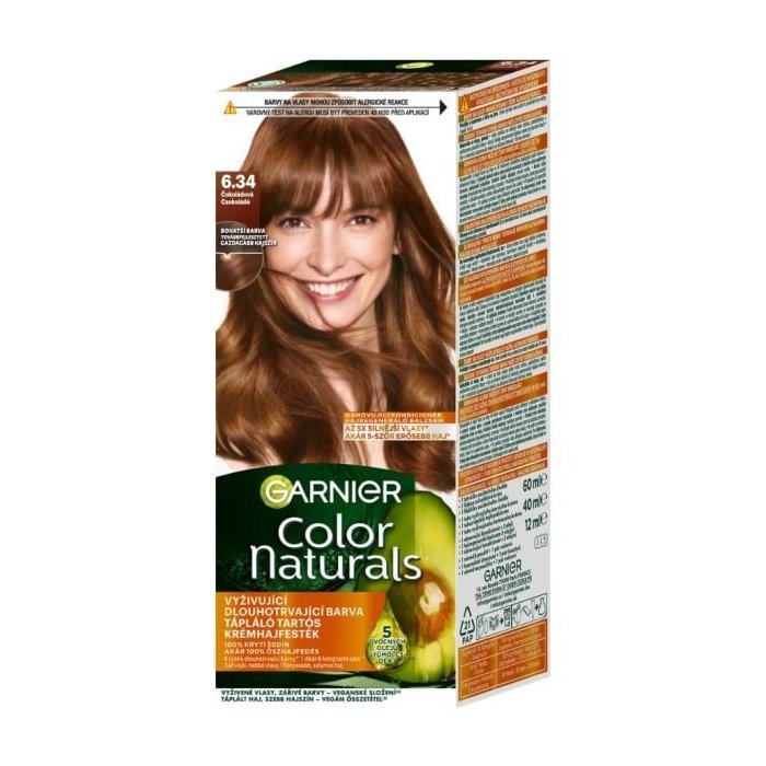 Garnier color naturals je vyživujúca farba na vlasy so zložením obohateným o 5 olejov - olivový, avokádový, bambucké maslo, kokosový a arganový - dodá vašim vlasom lesk a jemnosť. Farba vlasy intenzívne vyživuje, vyhladzuje povrch vlasového vlákna a vytvára ochrannú vrstvu. Technológia „Color boost“ pre bohatšiu a dlhotrvajúcu farbu preniká do vlasových vlákien a vypĺňa ich bohatou farbou. Vďaka záverečnej úprave s 5 olejmi je farba sýta a dlhotrvajúca. Výsledkom sú 5 x silnejšie vlasy, 100 % krytie šedín, ochrana pred vysúšaním a intenzívne odtiene až na 8 týždňov. Doprajte si krásne vlasy plné žiarivých odtieňov s farbou Garnier color naturals!