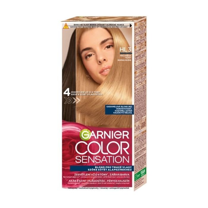 Permanentná zosvetľujúca farba na vlasy Garnier Color Sensation je ideálnou voľbou na zosvetlenie prírodne hnedých vlasov až o štyri tóny, a to bez nutnosti predchádzajúceho odfarbovania. Vďaka svojej krémovej konzistencii, ktorá nesteká, sa ľahko nanáša a rovnomerne pokryje všetky vlasy. Je vhodná pre všetky typy vlasov, rovné, vlnité aj kučeravé. Farba vytvára žiarivý blond odtieň bez nežiaducich mosadzných tónov a prirodzene vybledne, takže nezanecháva ostré odrasty. Optimálne kryje prvé šediny, zvýrazňuje prirodzený odtieň vlasov a dodáva im lesk. Výsledný odtieň vydrží šesť až osem týždňov, pričom si zachováva svoju intenzitu. Záverečná starostlivosť obohatená o ružový olej vyživuje vlasy, dodáva im hebkosť a lesk a zároveň bojuje proti teplým podtónom.