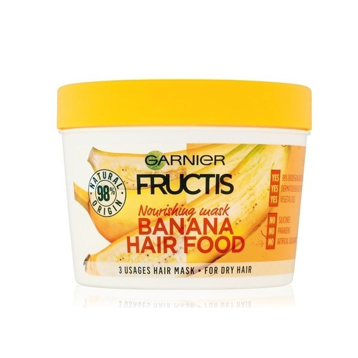 Skoncujte s poškodenými a suchými vlasmi raz navždy s GARNIER Fructis Banana Hair Food. Maska na vlasy Garnier Hair Food s prídavkom banánov a rastlinných olejov sa účinne a šetrne stará o vaše suché vlasy a navracia im pôvodnú vitalitu. GARNIER Fructis Banana obsahuje 98 % prírodných látok a je úplne bez obsahu parabénov, silikónu a umelých farbív. S maskou Hair Food spoznáte silu banánov na vlastných vlasoch a získate späť ich stratenú jemnosť a hebkosť.