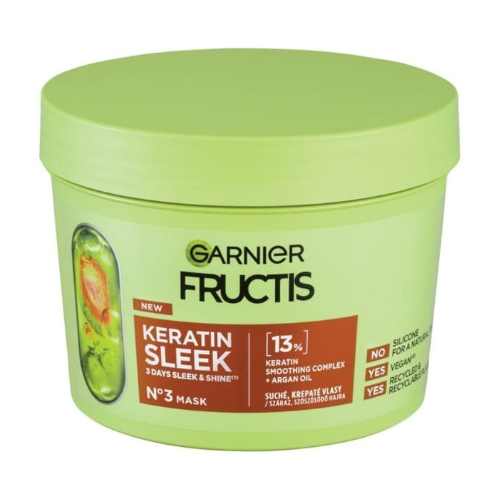 Máte pocit, že vaše vlasy potrebujú viac než len bežný kondicionér? Objavte vyhladzujúcu masku Garnier Fructis Keratin Sleek, ktorá je navrhnutá pre neposlušné, krepovité alebo oslabené vlasy. Vďaka vysokej koncentrácii keratínu rastlinného pôvodu a vyživujúcich zložiek preniká hlboko do vlasového vlákna, posilňuje ho, regeneruje a uhladzuje.