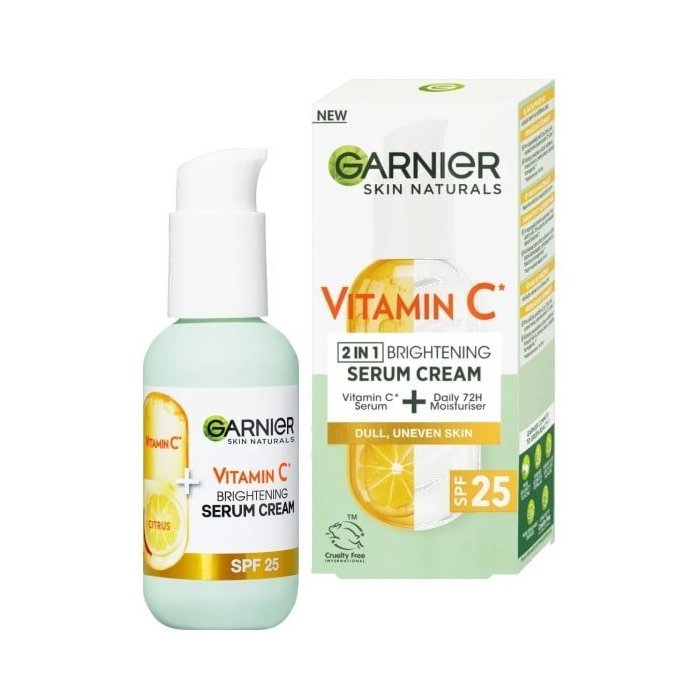 Garnier Skin Naturals krémové pleťové sérum Vitamín C pomáha zvýšiť žiarivosť pleti a redukuje tmavé škvrny. Funguje ako sérum a hydratuje ako krém. Zloženie séra je obohatené o 20% vitamínu C na rozjasnenie pleti a zjednotenie tónu pokožky. Vitamín C má na pleť rozjasňujúce účinky. Zdravý lesk vašej pokožky sa vďaka krémovému pleťovému séru od značky Garnier Skin Naturals môže dostaviť iba za 3 dni.