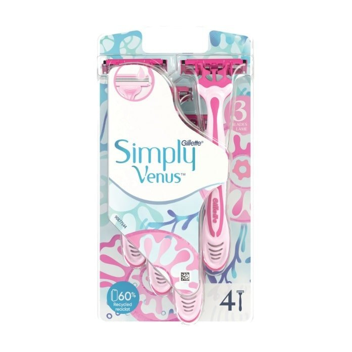 Dámsky jednorázový holiaci strojček Gillette Simply Venus 3 má 3 čepieľky na dôkladnejšie oholenie s menším výskytom drobných poranení pokožky (v porovnaní s holiacim strojčekom Simply Venus 2). Má aj zvlhčujúci pásik MoistureRich pre hladký sklz po pokožke a ochranné mikrolamely, ktoré pomáhajú zmierniť výskyt drobných poranení pokožky.