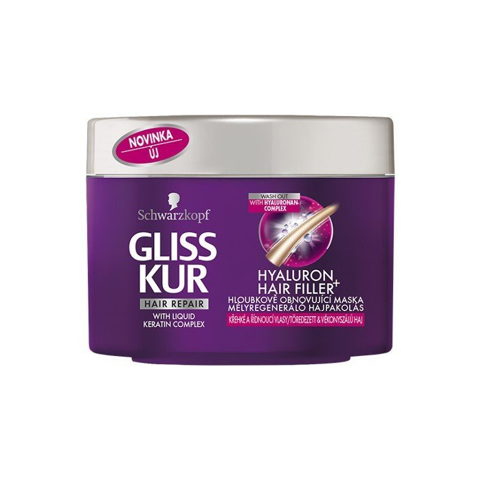 GLISS KUR Hyaluron+Hair Filler, Hĺbková regeneračná maska na suché, lámavé a rednúce vlasy 200ml Vlasy sú jednou z najdôležitejších „ozdôb“ každej ženy a preto by sme im mali venovať správnu starostlivosť. No každý typ vlasov je odlišný a preto si vyžaduje rozličné účinné zložky. Ošetrujúce rady Gliss Kur obsahujú špeciálne aktívne komplexy, ktoré sú vyvinuté a prispôsobené priamo pre jednotlivé typy vlasov. Nová ošetrujúca receptúra s hyalurónovým komplexom - Hyaluron + Hair Filler - vypĺňa stárnúcu štruktúru vlasov priamo z vnútra. Je výborným riešením v starostlivosti o suché, lámavé a rednúce vlasy. Výsledkom budú viditeľne hustejšie, zdravšie a hebkejšie vlasy . Pomôžte svojim vlasom opať získať svoju vnútornú silu, hustotu a hebkosť. Ak aj Vás trápia prejavy starnutia vlasov, tak Vám určite odporúčame vyskúšať túto hĺbkovú regeneračnú masku. Omlaďte svoju korunu krásy! Použitie: Vmasírujte 2 až 3 krát do týždňa do vlhkých vlasov a nechajte pôsobiť aspoň 1 minútu. Následne opláchnite.