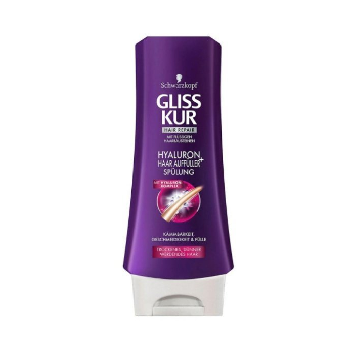 GLISS KUR Hyaluron + Hair Filler, regeneračný balzam na vlasy 200ml Pre plnšie a pružnejšie vlasy. Regenračný balzám Hyaluron + Hair Filler uspokojuje potreby suchých, lámavých a rednúcich vlasov. Pre perfektné rozčesávateľnosť a plné vlasy. Receptúra s Hyaluronan-Komplexom vypĺňa štruktúru zrelých vlasov zvnútra. Vlasy znovu získávajú svoju vnútornú silu, sú plnšie a znateľne pružnejšie.