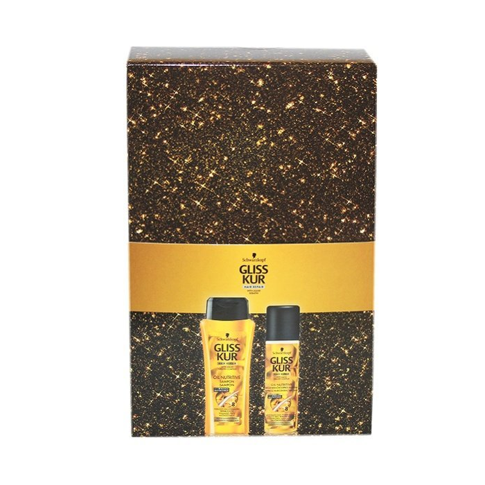 Gliss Kur Oil Nutritive Dámska darčeková kazeta, Gliss Kur šampón na vlasy 250ml + Gliss Kur expresný regeneračný kondicionér 200ml Darčeková kazeta obsahuje: - Gliss Kur Oil Nutritive šampón na vlasy - proti lámaniu vlasov s arganovým olejem a bambuckým maslom, regeneruje a obnovuje štruktúru suchých vlasov a predchádza rozdvojovaniu, krepovateniu končekov. SCAN REPAIR komplex dôkladne regeneruje a obnovuje poškodenú štruktúru vlasov bez zaťaženia. - Gliss Kur Oil Nutritive expresný regeneračný kondicionér - na dlhšie vlasy náchylné na štiepenie končekov. Receptúra so 7 regeneračnými olejmi a komplexom tekutého keratínu účinne regeneruje a obnovuje vlasové vlákna a končeky vlasov a okamžite uľahčuje rozčesávanie. Pre viditeľnú hebkosť a až do 95% menej rozštiepených končekov.