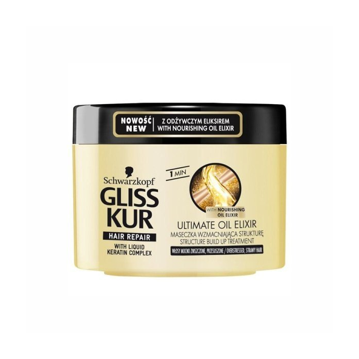Gliss Kur Ultimate Oil Elixir, intenzívna regeneračná maska proti lámavosti vlasov 200ml Maska je určená pre veľmi namáhavé, slamené vlasy. Obsahuje ošetrujúci olejový elixír a komplex Liquid Keratin, ktoré poskytujú vlasom intenzívnu starostlivosť a okamžite uľahčuje rozčesávanie. Posilňuje vlasovú štruktúru a znižuje lámavosť vlasov. Použitie: Vmasírujte 2-3 krát za týždeň do vlhkých vlasov a nechajte pôsobiť 1 minútu. Potom dôkladne opláchnite!