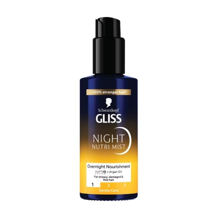 Doprajte svojim vlasom regeneráciu počas spánku so Schwarzkopf Gliss Night Nutri Mist, nočnou výživou pre rozštiepené, poškodené a jemné vlasy. Ošetrujúce zloženie s arganovým olejom vyživuje vlasové vlákna počas noci a pomáha obnoviť ich pevnosť, hebkosť a prirodzený lesk. Ráno sú vlasy viditeľne hladšie, poddajnejšie a pripravené na jednoduchú úpravu.