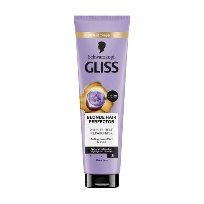Gliss Blonde Hair Perfector 2-v-1 fialová regeneračná maska neutralizujúca žlté tóny a dodávajúca lesk pre prirodzené, farbené alebo melírované blond vlasy. So systémom Haptiq, ktorý vytvára mikroväzby a posilňuje vlasovú štruktúru - pre krásne výsledky, ktoré môžete vidieť a cítiť.