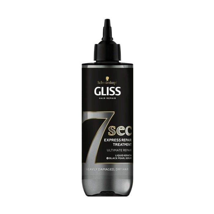 Expresná regeneračná kúra na vlasy 7 sec Ultimate Repair od značky Schwarzkopf Gliss poskytuje intenzívne vyživujúcu starostlivosť pre veľmi poškodené a suché vlasy. Nezaťažujúca tekutá textúra a receptúra s obsahom keratínu a séra z čiernych perál vlasy hydratuje a dôkladne zvlhčí a zaistí až o 90 % menej poškodených vlasov pri česaní. Maska sa počas aplikácie premení na jemný krém, ktorý vlasy zanechá hebké a žiarivé. Maska pôsobí rovnako ako bežná maska na vlasy, ale potrebuje len krátkych 7 sekúnd. Fľaša výrobku je vyrobená z 99 % recyklovaného plastu. Zverte svoje vlasy do rúk Schwarzkopf Gliss!