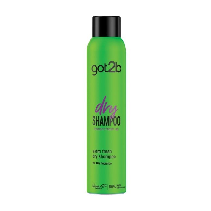 Schwarzkopf got2b suchý šampón Extra Fresh čistí a osviežuje vlasy počas chvíľky medzi umývaniami. Vychutnajte si dlhotrvajúcu sviežosť bez bielych zvyškov**, ktorá vydrží až 48 hodín. Zloženie produktu je vegánske*. Užite si jednoduchú aplikáciu a perfektný výsledok od značky Schwarzkopf got2b. * Bez prísad živočíšneho pôvodu. ** Po vyčesaní. Telo plechovky je z 50% z recyklovaného hliníka.
