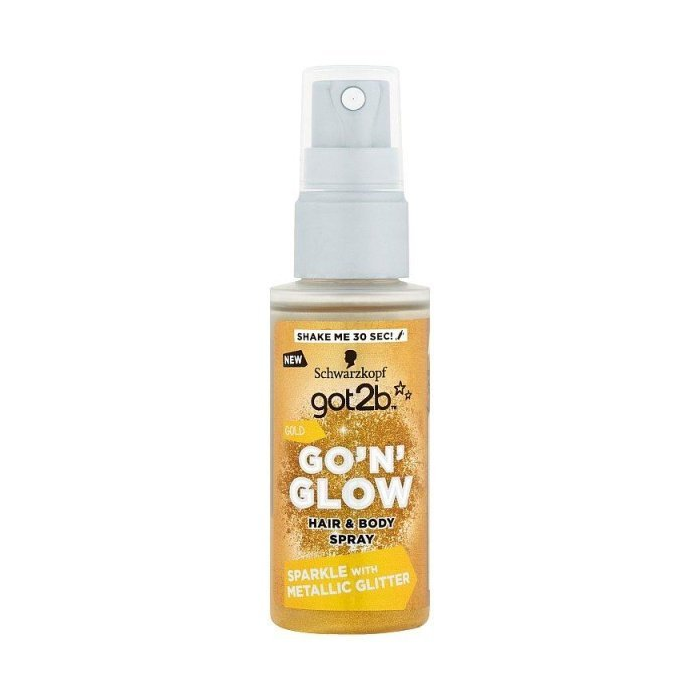 Viditeľný na všetkých typoch a farbách vlasov, dokonca aj na tých najtmavších vlasoch! Sprej got2b Go'N'Glow dodáva tvojim vlasom a pokožke okamžitý zlatý lesk s ktorým zažiariš! Si pripravená na párty či festival a chceš trochu okoreniť svoj vzhľad? Chceš, aby tvoje vlasy a pokožka zažiarili? Potom sprej got2b Go'N'Glow je pre teba ten správny produkt! Vysokolesklé metalické efekty okamžite dodajú tvojim vlasom intenzívny a bohatý lesk, ktorý je viditeľný aj na tých najtmavších vlasoch! Vymýva sa po 1 umytí šampónom.