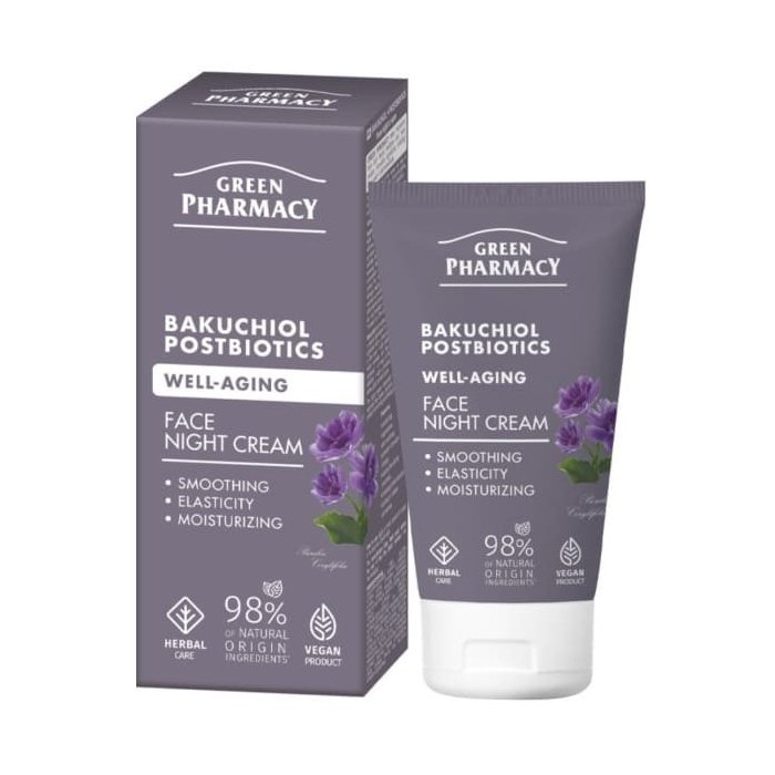 Nočný krém s bakuchiolom a postbiotikami intenzívne hydratuje a podporuje bariérové funkcie pleti. Chráni pred vysychaním a šupinatením. Má upokojujúci a regeneračný účinok, je vhodný pre zrelú pleť alebo pleť, ktorá potrebuje intenzívnejšiu starostlivosť. Aktívne pôsobí na obnovu a podporu pleti počas spánku, čím prispieva k zdravému vzhľadu a znižovaniu známok starnutia.