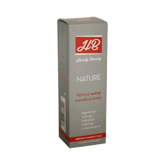 HB Nature Výživný nočný mandľový krém, pre suchú a citlivú pleť 50g HB Cosmetics Natural výživný mandľový krém je vysoko výživný, vhodný na ošetrenie suchej, veľmi suchej a citlivej pleti, s obsahom prírodného mandľového oleja, ktorý má silné regeneračné účinky a zároveň chráni pleť pred nepriaznivými vplyvmi prostredia. Prírodný mandľový olej, ktorý má silné regeneračné účinky, zjemňuje a zvláčňuje pokožku a pri pravidelnom používaní zabraňuje tvorbe vrások a predčasnému starnutiu, napomáha k obnove buniek. Použitie: Krém nanášajte dôkladne na vyčistenú pleť. Potrebné množstvo krému vmasírujte krúživými pohybmi do pokožky tváre, krku a dekoltu. Pri pravidelnom používaní dosiahnete viditeľnú redukciu vrások. - neobsahuje parabény a farbivá Dermatologicky testované.