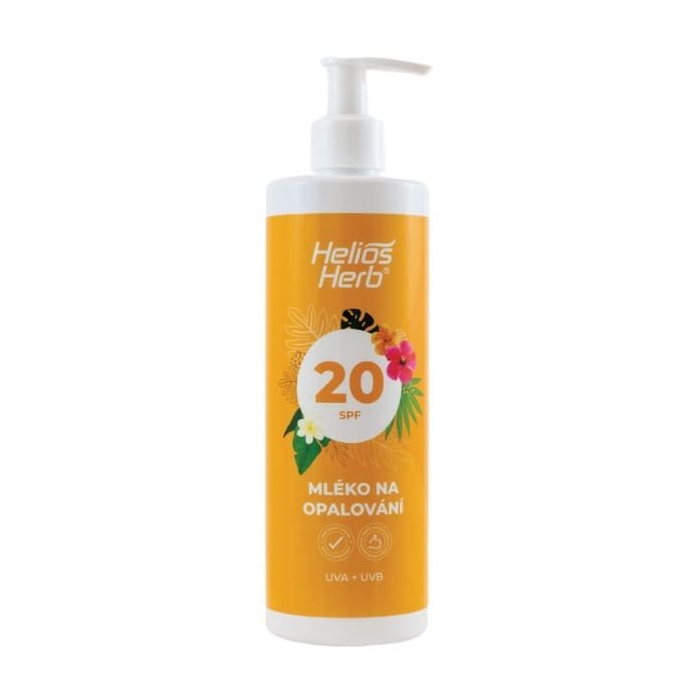 Helios Herb Mlieko na opaľovanie s ochranným faktorom 20 chráni pokožku pred spálením slnkom a škodlivým UVA aj UVB žiarením. Predlžuje dobu bezpečného pobytu na slnku až dvadsaťkrát. Obsiahnutý betakarotén podporuje trvalejšie opálenie pokožky.