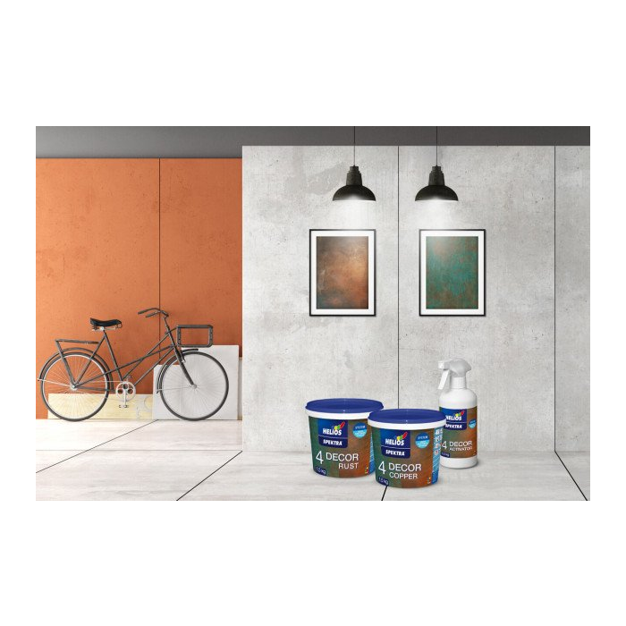 SPEKTRA DECOR RUST (1,5 kg) je základný náter založený na vode, ktorý po nanesení oxidujúceho výrobku SPEKTRA DECOR ACTIVATOR (0,5 kg)zanechá vzhľad hrdze, ktorý je veľmi podobný železu, ktoré hrdzavie kvôli tomu, že je vystavené vplyvom počasia.