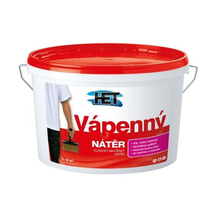 Vápenný náter HET. Biely maliarsky náter do interiéru a exteriéru, určený na nátery a dezinfekciu všetkých vonkajších a vnútorných minerálnych podkladov a na obmedzenie tvorby plesní v obytných priestoroch, skladoch potravín, stajniach, pivniciach a pod.