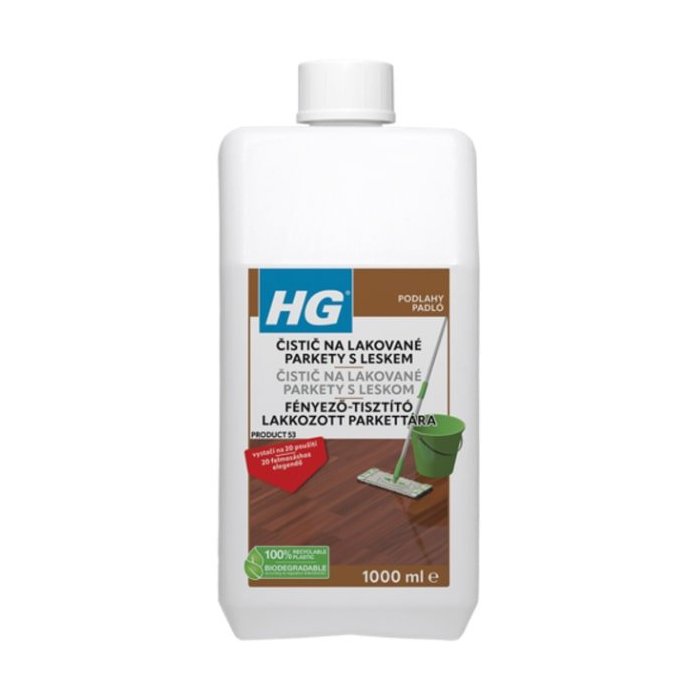 HG čistič s leskom na parketové podlahy (čistič s leskom) (HG výrobok 53) je koncentrovaný čistiaci prostriedok s príjemne sviežou vônou na obnovu lesku, špeciálne vyvinutý na pravidelné čistenie lakovaných parkiet, ako aj parkiet ošetrených produktom HG ochranné filmy na parkety (HG product 51/52).