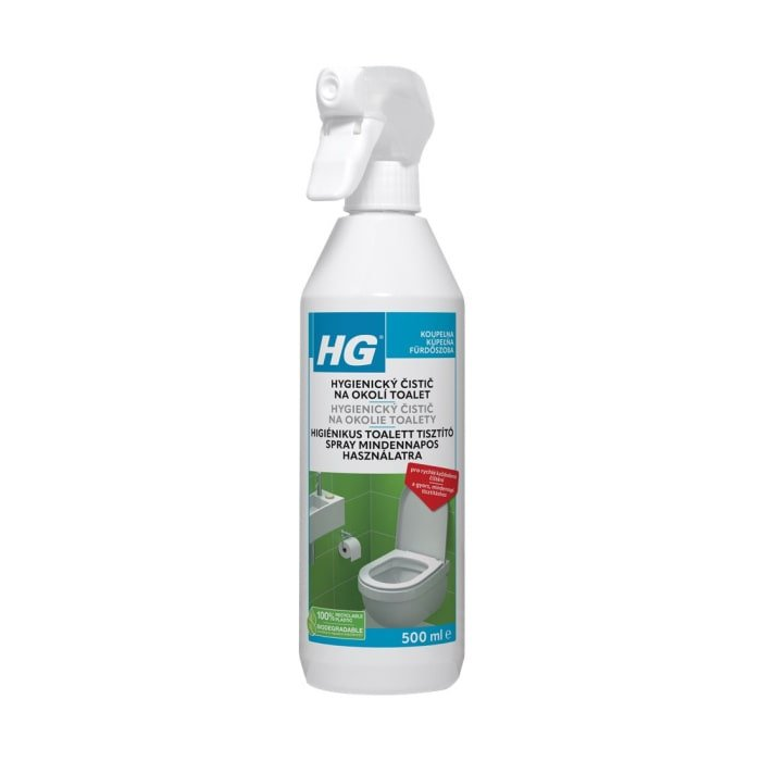 HG každodenný hygienický sprej na príslušenstvo v okolí toalety je rýchlo schnúci čistic v spreji s čerstvou vônou na rýchle každodenné a hygienické čistenie predmetov v oblasti toalety, ako je sedacia časť, vonkajšia strana misy, nádržka, umývadlo, kohútik a aj rúčka dverí. Špeciálne zoženie čistiaceho prípravku HG každodenný hygienický sprej na príslušenstvo v okolí toalety zabezpečuje najlepší hygienický výsledok.