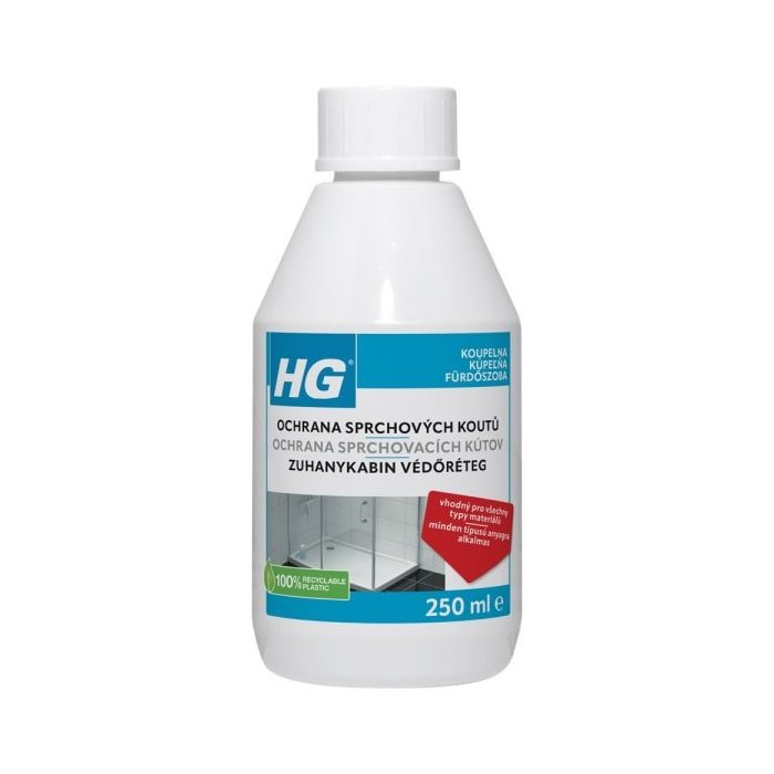 HG ochrana sprchovacích kútov chráni všetky materiály sprchovacieho kúta a v sprchovacom kúte pred usadzovaním vápnika a iných nečistôt, ako sú zvyšky mydla, kúpeľového oleja, telesného maziva atď. HG ochrana sprchovacích kútov chráni sklenené povrchy, obkladačky, batérie a iné materiály pred nečistotou a vodou, vďaka čomu nie je čistenie potrebné tak často a je oveľa jednoduchšie.
