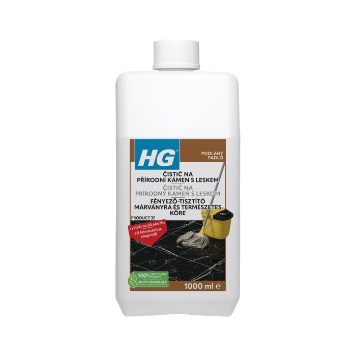 HG čistič s leskom (lesklá ochrana na mramorové podlahy) (HG výrobok 37)je koncentrovaný prostriedok na umývanie s príjemnou sviežou vônou, špeciálne vyvinutý na pravidelné čistenie mramoru a všetkých ostatných druhov vápencového prírodného kameňa. Je vhodný pre neošetrované podlahy, ako aj pre podlahy ošetrené produktom HG ochranný film s leskom (ochrana a lesk) (HG výrobok 33).