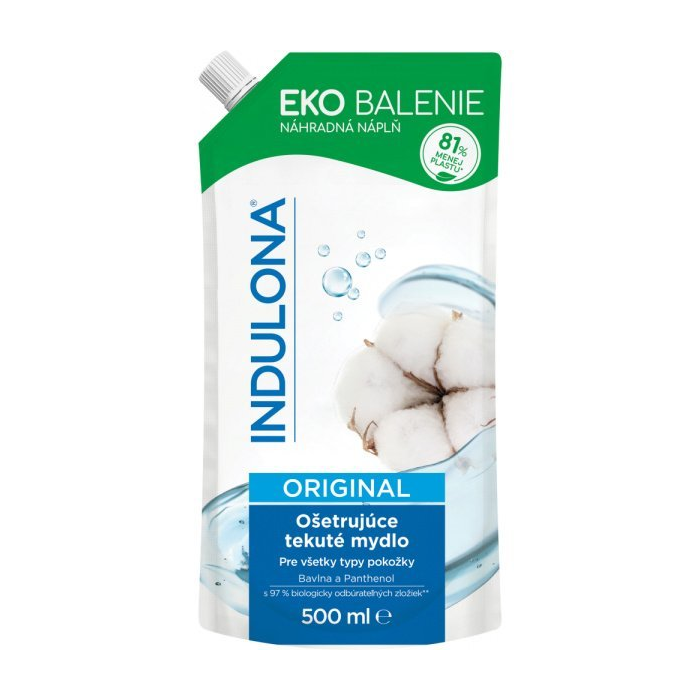 Indulona Ošetrujúce tekuté mydlo ORIGINAL s bavlnou a panthenolom bolo špeciálne vyvinuté tak, aby poskytovalo účinné čistenie a jemnú starostlivosť pokožke rúk. Zloženie obohatené o hydratačné zložky zanecháva po umytí pokožku rúk jemnú a vláčnu. Vhodné na každodenné použitie, pre celú rodinu. Pre všetky typy pokožky. Dermatologicky testované. S 97 % biologicky odbúrateľných zložiek (ľahko biologicky odbúrateľné zložky podľa OECD301 vrátane vody).