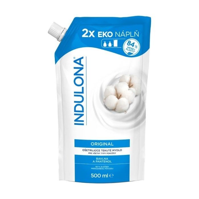 Indulona Ošetrujúce tekuté mydlo Original s mliekom z bavlníka a pantenolom bolo špeciálne vyvinuté tak, aby poskytovalo účinné čistenie a jemnú starostlivosť pokožke rúk. Zloženie obohatené o prírodné zložky s hydratačnými vlastnosťami pomáha zanechať po umytí pokožku rúk jemnú a vláčnu. Vhodné na každodenné použitie, pre celú rodinu. Pre všetky typy pokožky. 84 % menej plastu **Tento obal obsahuje o 84 % menej plastu na mililiter oproti 250ml fľaši tekutého mydla Indulona s pumpičkou.