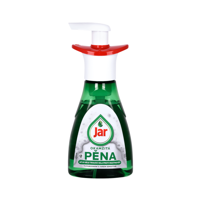 Nie je nutné hubku namáčať a stláčať, aby vznikla pena, stačí Jar naniesť rovno na hubku a ihneď umývať. Samozrejme nechýba tradičná vlastnosť Jari, silné umývacie a odmasťovacie schopnosti, ktoré riad účinne zbavia mastnoty a všetkých nečistôt a zanechajú ich žiarivo čisté a dokonale odmastené. Tekutý prostriedok Jar Active Foam je jemný a šetrný k vašej pokožke.