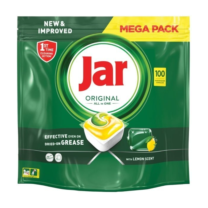 Kapsuly do umývačky riadu Jar Original All in One čistia hneď na prvýkrát, sú účinné aj pri zaschnutej mastnote a zanechajú váš riad žiarivo čistý. Jar kombinuje tekutinu a prášok do jednej silnej kapsuly. Jej vysokorozpustné vrecúško sa rýchlo rozpustí a čistí hneď od začiatku programu. A tak ľahko sa používajú! Nemusíte ich odbaľovať, stačí vložiť do dávkovača na čistiaci prostriedok do umývačky riadu.