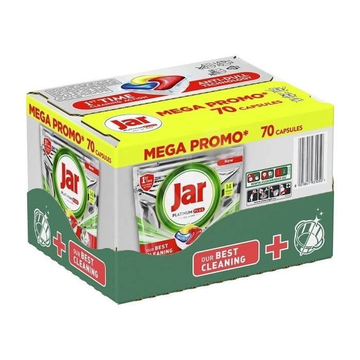 Jar tablety do umývačky, ktoré sú 100% účinné a zanechávajú vaše riady vysoko žiarivé a lesklé. Kapsule sa nerozbaľujú, ale vkladajú sa priamo do umývačky. Dokonale odstraňujú zaschnutú mastnotu. Navrhnuté a testované pre používanie v umývačkách popredných výrobcov. Zabraňujú usadzovaniu mastnoty v umývačke riadu.