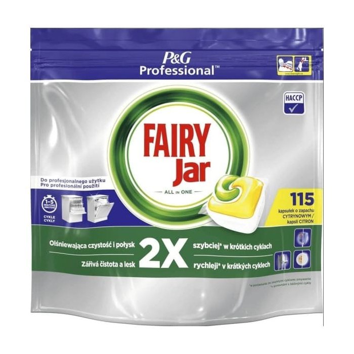 Kapsuly Jar Professional Original sú vyvinuté na umývanie riadu v umývačkách určených ako pre domácnosti, tak aj pre profesionálne použitie (umývací cyklus 1–5 minút). Účinne odstraňujú aj zaschnuté škvrny od rúžu, kávy a čaju. Rozpúšťajú sa 2 x rýchlejšie ako bežné pevné tablety. Povrchovo aktívne látky zabezpečujú dokonalé odstránenie zvyškov jedla a mastnoty z riadu a zabraňujú ich opätovnému usadzovaniu na príboroch, tanieroch a skle. Vhodné aj do umývačiek na sklo. Účinné pri všetkých stupňoch tvrdosti vody. Obal je recyklovateľný. V súlade s HACCP.