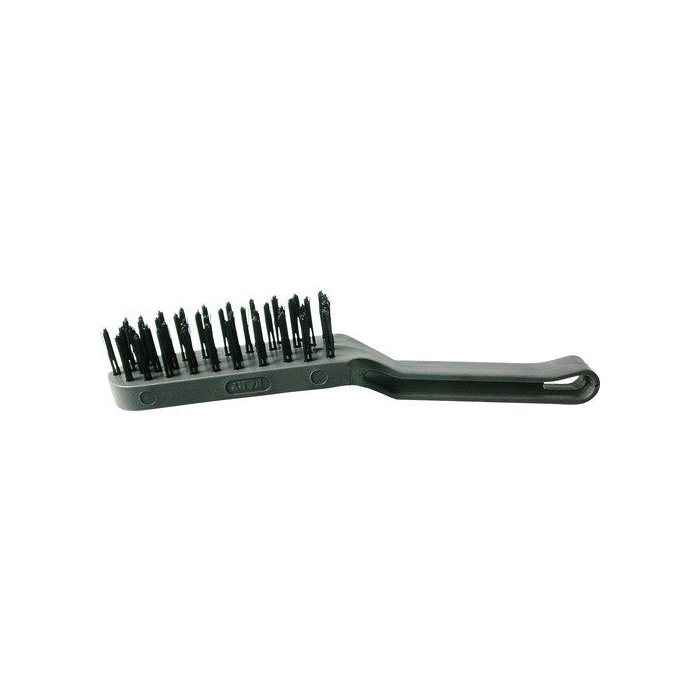 Oceľová kefa s plastovým držadlom na odstraňovanie hrubých nečistôt a odstraňovanie hrdze povrchu. Ukosené držadlo pre lepšiu ochranu ruky pri brúsení, otvor na zavesenie.