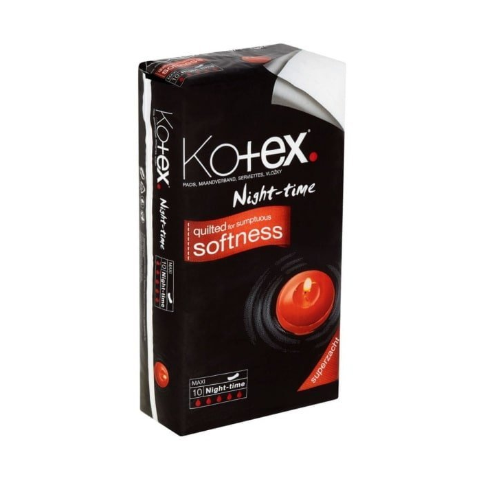 Kotex na noc – špeciálne navrhnuté vložky pre zvýšenú ochranu počas noci. Predĺžená vložka bezpečne chráni pred presiaknutím. Centrálne absorpčné jadro pomáha zachovať povrchovú vrstvu suchú. Savosť 3 kvapky.