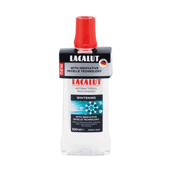 Túžite po prirodzene bielych a silných zuboch? Lacalut Whitening ústna voda so špeciálnou Micelle technológiou vytiahne baktérie ako magnet aj z ťažko dostupných miest uzavrie ich do malých flexibilných miciel a odstráni ich. Zároveň zmierňuje tvorbu zubného povlaku, redukuje baktérie. Vďaka dlhodobému účinku chráni zuby a ďasná a je šetrná k zubnej sklovine. Pre silné, prirodzene biele zuby a svieži dych ústna voda Lacalut Antibacterial Mouthwash Whitening.