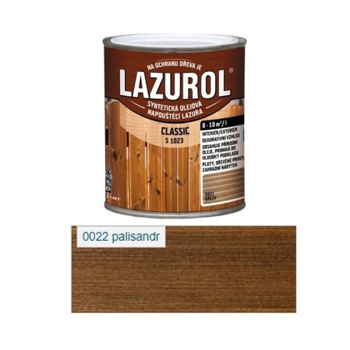 LAZUROL CLASSIC S 1023 je napúšťacia syntetická lazúra so zmesou voskov. Lazurovací lak sa používa na nátery dreva, drevotriesky a korku (záhradný nábytok, drevené štíty, podhľady, obloženie stien a stropov, ploty, chaty a drevené domčeky, okná, dvere, korok, penetrácia drevených podláh. Použiť sa môže v interiéri aj v exteriéri (s výnimkou bezfarebného odtieňa).