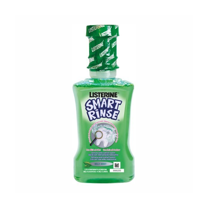 Ústna voda Listerine Smart Rinse od 6 rokov účinne zabraňuje tvorbe škodlivého zubného povlaku, a to aj v miestach, kam nedosiahne zubná kefka. Obsiahnutý fluorid prispieva zároveň k dokonalejšej ochrane pred zubným kazom. Výrobok neobsahuje alkohol a má príjemnú mentolovä chuť. Vďaka mimoriadne citlivému zloženiu zostáva zachovaná rovnováha ústnej flóry. Vhodné aj pri používaní strojčeka na zuby. Používať, len ak si dieťa vie vyplachovať ústa.