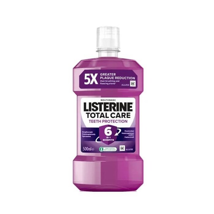 Šesťnásobný účinok ústnej vody Listerine Total Care Teeth Protection Clean Mint pri používaní dvakrát denne poskytuje komplexnú ochranu zubov a ďasien. Účinné zloženie ústnej vody s esenciálnymi olejmi, fluoridom a chloridom zinočnatým bojuje proti škodlivým baktériám, predchádza zubnému kazu a zabraňuje vzniku zubného kameňa. Zachováva prirodzenú belosť zubov a mentolová príchuť sa postará o dlhotrvajúci svieži dych. Ústna voda Listerine Total Care Teeth Protection má antibakteriálny účinok - klinicky dokázaný. Zároveň sa zachováva rovnováha ústnej flóry.