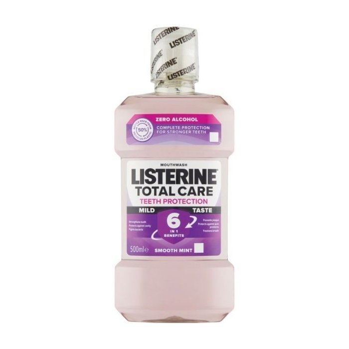Ústna voda Listerine® Total Care Teeth Protection Mild Taste pri používaní dvakrát denne zlepšuje ústnu hygienu - s esenciálnymi olejmi, fluoridom a chloridom zinočnatým.