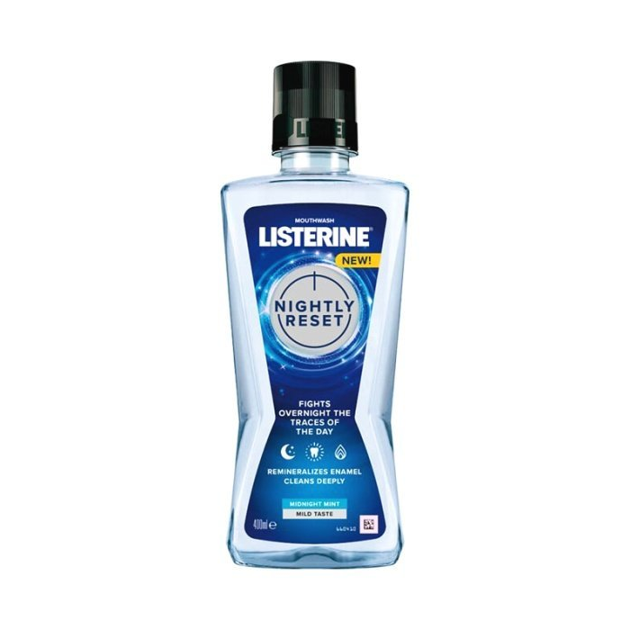 LISTERINE Nightly Reset obmedzuje tvorbu kyselín, pomocou technológie RAPID-FUSION ™ remineralizuje zubnú sklovinu pre účinnejšie vstrebávanie fluoridu a silnejšie zuby. Zloženie počas noci bojuje s vplyvmi, ktorým boli zuby vystavené cez deň. Čistí do hĺbky aj tam, kam zubná kefka nedosiahne.