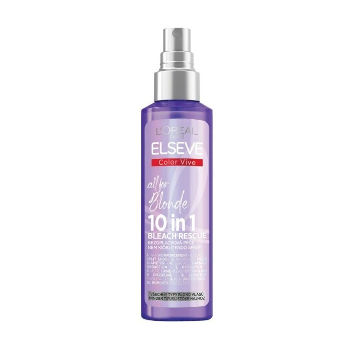 Bezoplachový sprej na blond vlasy Color Vive all for Blonde 10in1 značky L'Oréal Paris Elseve sa stará o všetky typy blond vlasov, ktorým zabezpečuje až 10 benefitov v 1 prípravku. Posilňuje vlasy a znižuje ich lámavosť až o 99 %, zároveň pomáha zaceliť rozštiepené končeky a znížiť poškodenie vlasov.