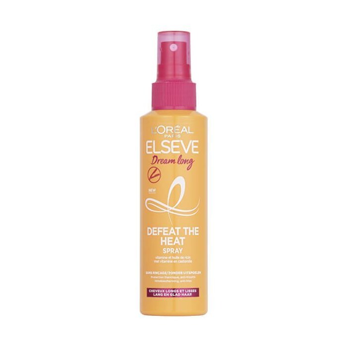 L'Oréal Paris Elséve sprej na ochranu vlasov pred teplom Dream long Defeat The Heat zaisťuje tepelnú ochranu vašim dlhým vlasom pri žehlení či inom tepelnom stylingu. Obsahuje nezaťažujúce ochranné zloženie, ktoré vlasy chránia proti poškodeniu teplom, vonkajším vplyvom a vlhkosti. Elséve sprej na vlasy pre tepelnú ochranu je obohatený o vitamíny a ricínový olej pre hladký účes a lesklé vlasy bez krepovatenia až po dobu 3 dní. Pre spoľahlivú ochranu pred teplom a zdravo vyzerajúce, lesklé a hebké vlasy je sprej Elséve Dream long tou správnou voľbou!