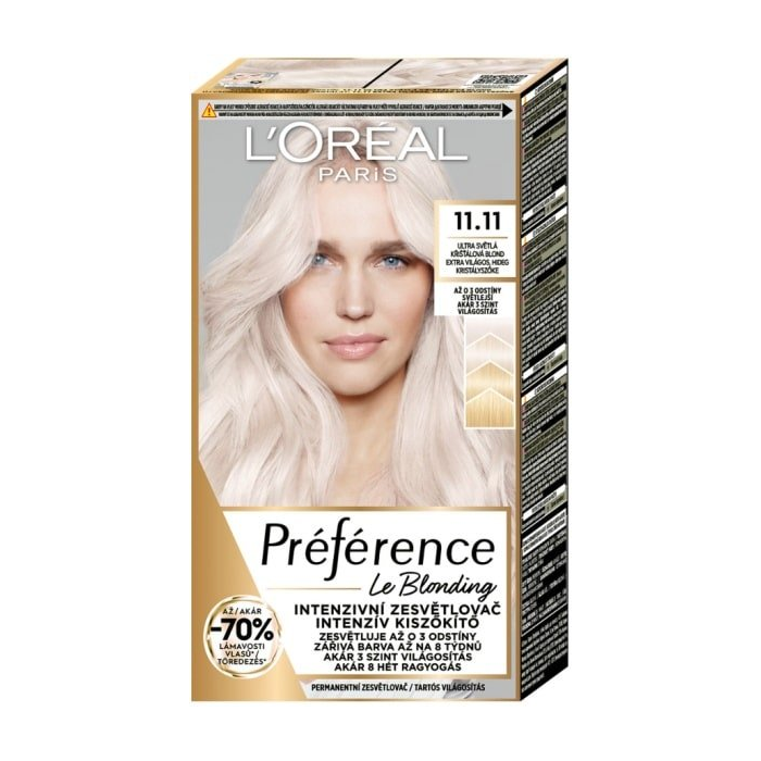 L'Oréal Paris Préférence intenzívny zosvetľovač na vlasy Le Blonding v sebe skrýva tajomstvo dokonalej žiarivosti a zosvetlí farbu vašich vlasoch až o 3 odtiene. Ošetrujúca starostlivosť zabezpečí až o - 70 % lámavosti vlasov pre ešte lepší výsledok a ochranu vlasov. Získaná žiarivá farba vydrží až na 8 týždňov. Pre jedinečne žiarivú a oslňujúcu blond farbu. Objavte jedinečné blond odtiene so zosvetľovačom na vlasy Préférence Le Blonding so svetlo odrážajúcimi pigmentmi na dosiahnutie žiarivej farby plnej lesku!