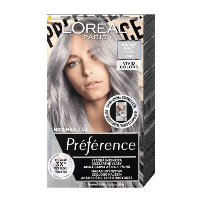 L'Oréal Paris Préférence Vivid Colors farba na vlasy vo výraznom odtieni Silver Grey Soho s intenzívnymi farebnými pigmentami dodá vašim vlasom permanentné prekrytie s trojnásobným leskom. Vlasy pôsobia ako čerstvo nafarbené až 8 týždňov! Farba spoľahlivo a 100 % prekrýva aj šedivé vlasy. Vďaka priesvitnému gélovému zloženiu sa farba ľahko nanáša, nesteká a je teda skvelá na domáce použitie. Záverečná starostlivosť v podobe balzamu je obohatená o vitamín E a UV ochranu pre ochranu a hydratáciu vlasov. Vlasy budú krásne lesklé a hodvábne jemné.