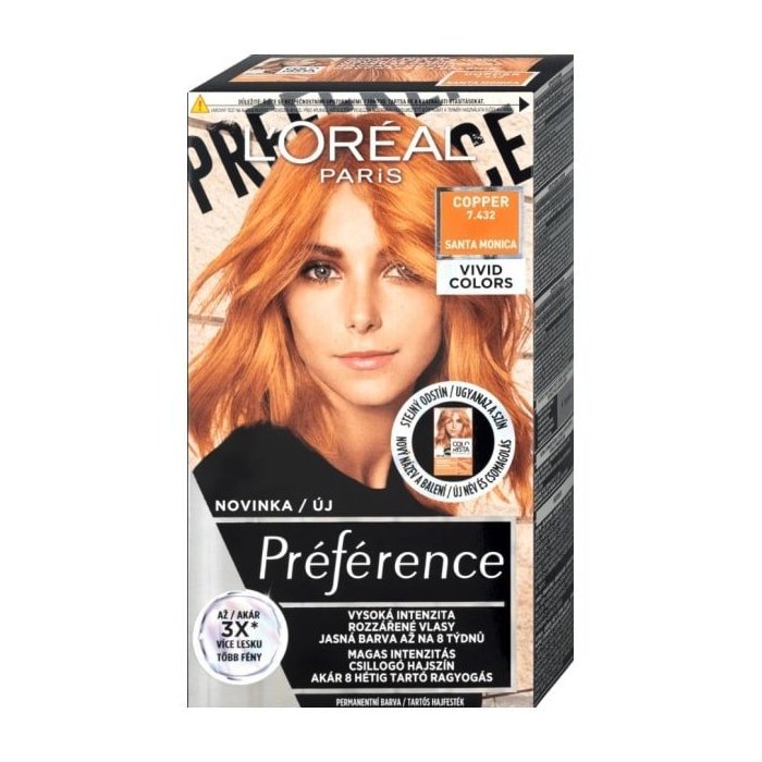L'Oréal Paris Préférence Vivid Colors farba na vlasy vo výraznom odtieni Copper Santa Monica s intenzívnymi farebnými pigmentami dodá vašim vlasom permanentné prekrytie s trojnásobným leskom. Vlasy pôsobia ako čerstvo nafarbené až 8 týždňov! Farba spoľahlivo a 100 % prekrýva aj šedivé vlasy. Vďaka priesvitnému gélovému zloženiu sa farba ľahko nanáša, nesteká a je teda skvelá na domáce použitie. Záverečná starostlivosť v podobe balzamu je obohatená o vitamín E a UV ochranu pre ochranu a hydratáciu vlasov. Vlasy budú krásne lesklé a hodvábne jemné.