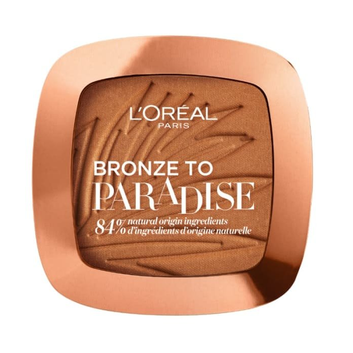BACK TO PARADISE od L'Oréal. Hnedý púder. Zanecháva na pokožke lákavý matný povrch. Skvele sa hodí na kontúrovanie a modelovanie. Okrem toho sa dá použiť na otepľovanie pleti. 84% sa skladá z produktov prírodného pôvodu vrátane o. i. Kokosový a mangový extrakt. Po aplikácii dodáva pleti svieži a zdravý vzhľad. Výrobok je uzavretý v praktickom plastovom obale, takže je ideálny na cestovanie a výlety.